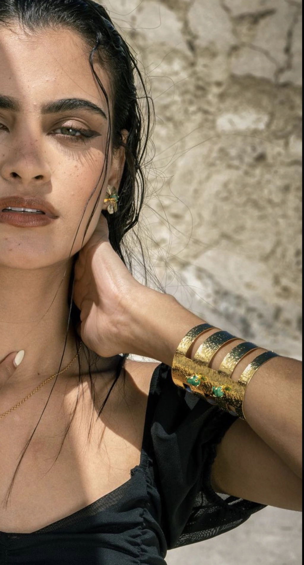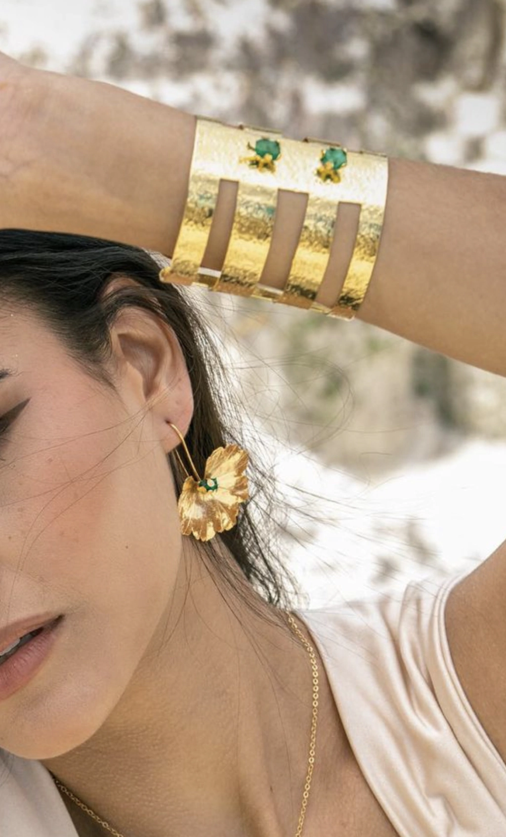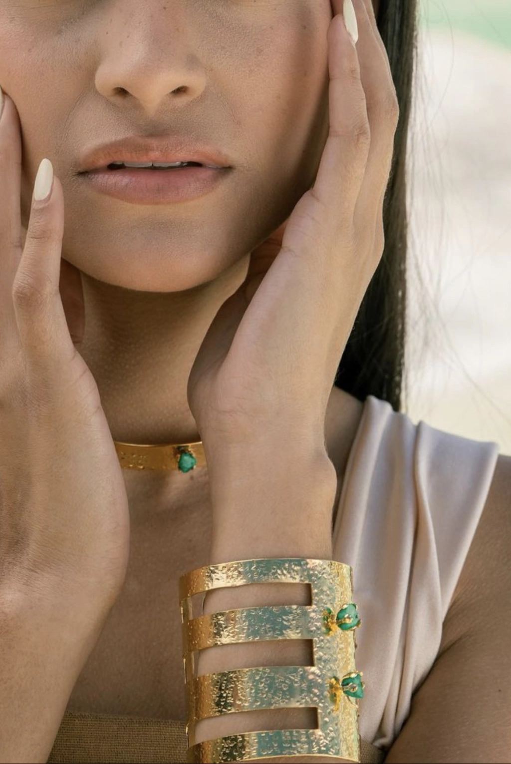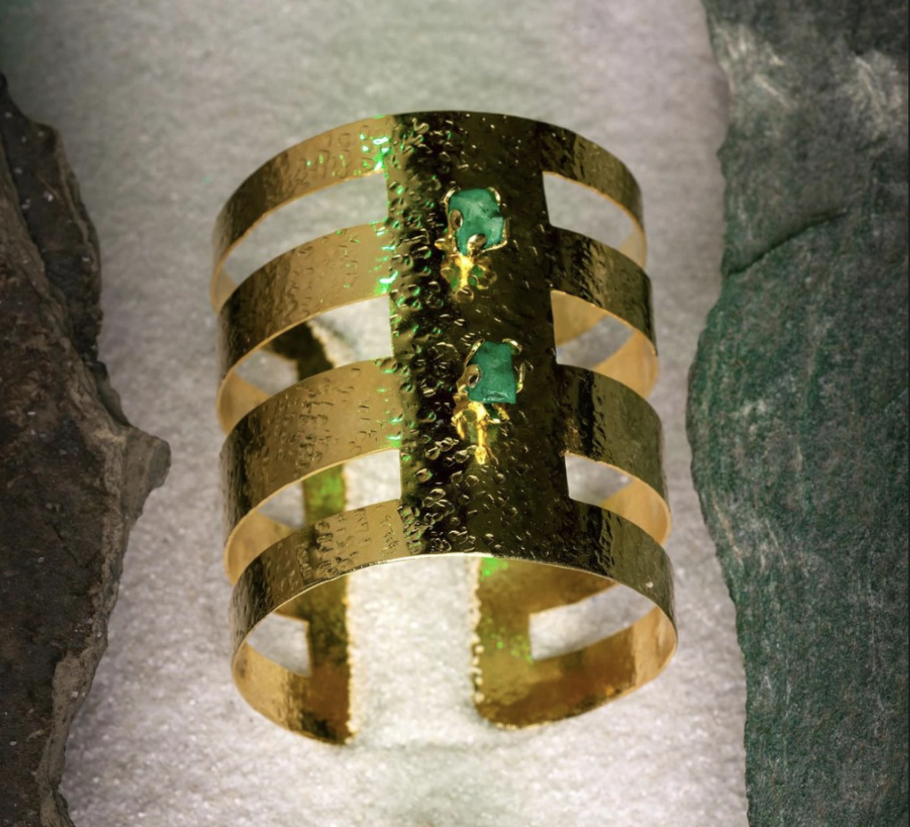 Brazalete realizado en bronce bañado en oro 24k con incrustacion de piedras naturales turquesas.
